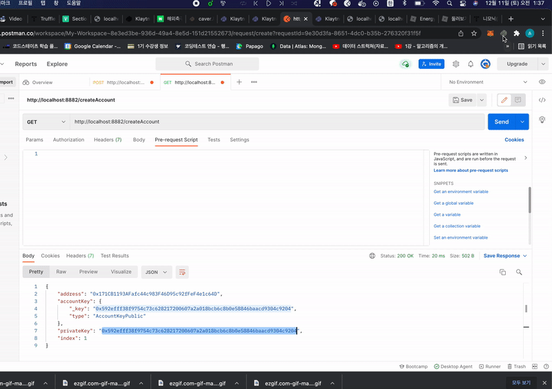 전체적으로 코드가 다실행이 되면 위에 gif에서 보는 것처럼 address, privatekey등이 발생한다.
