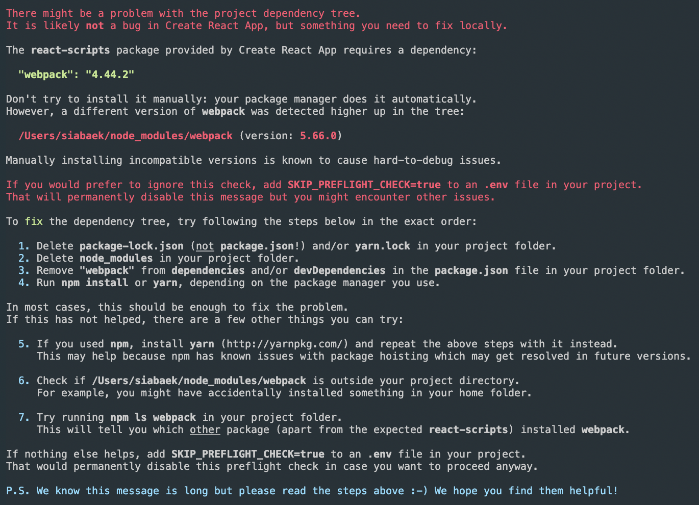 [오류해결] npm start 시 "There might be a problem with the project dependency tree..." 본문
