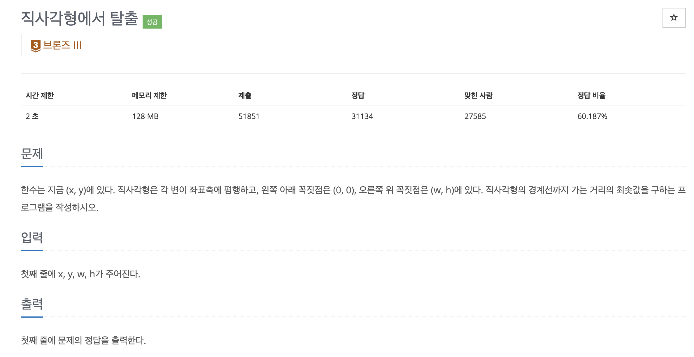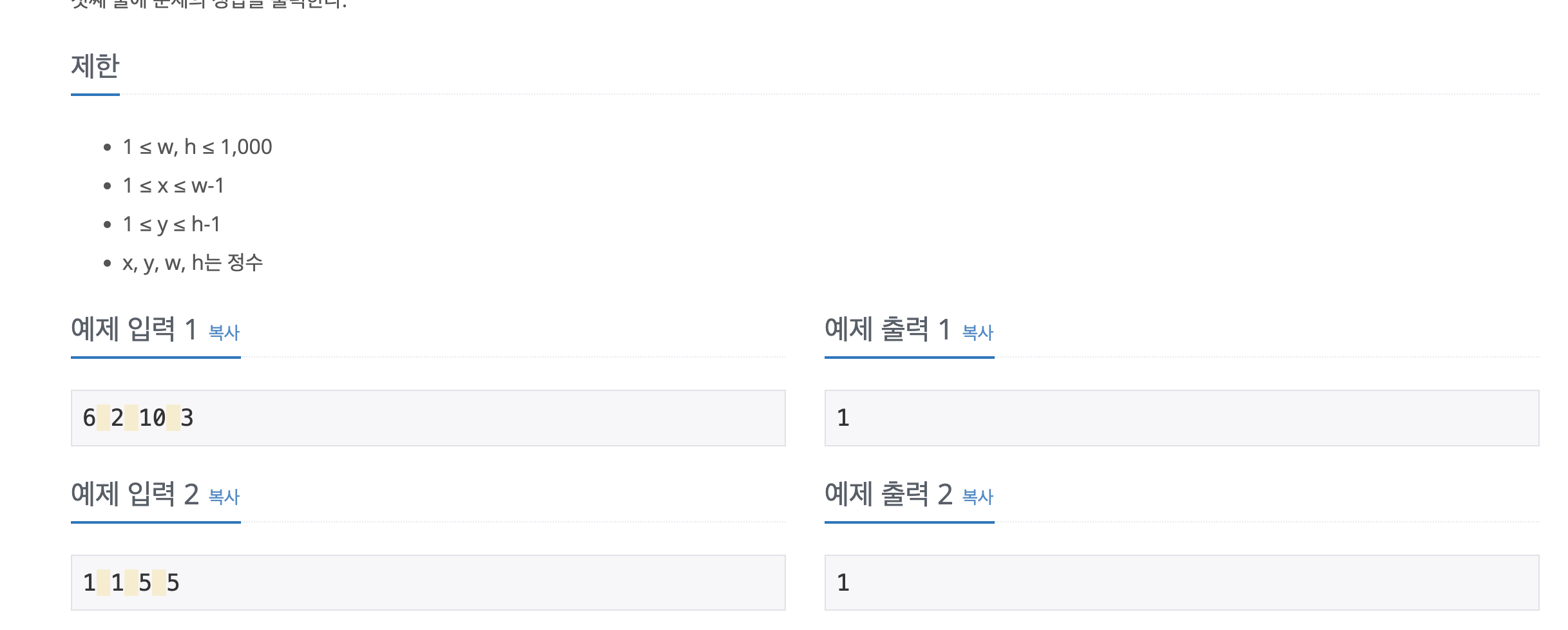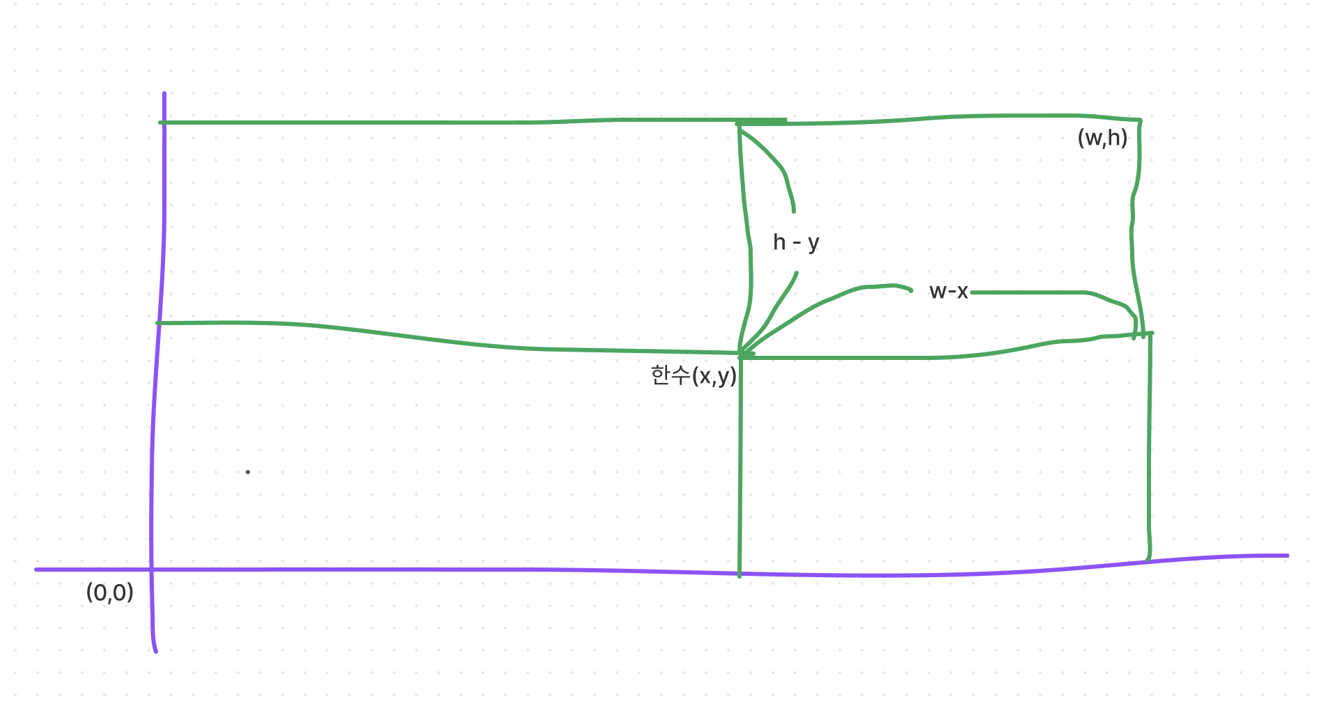 즉, 다시말해서 현수위치에서 저 (w,h)크기의 네모를 벗어난다는 말입니다. 즉 다시말해서 x축, y축 중 어디로 움직여야지 가장 최소값으로 벗어날 수 있는지 코드로 구해보시오!! 이말입니다.