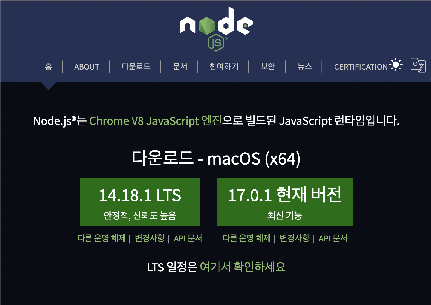 먼저 Node.js는 홈페이지가서 가장 최신 버전(오른쪽꺼)으로 설치합니다
