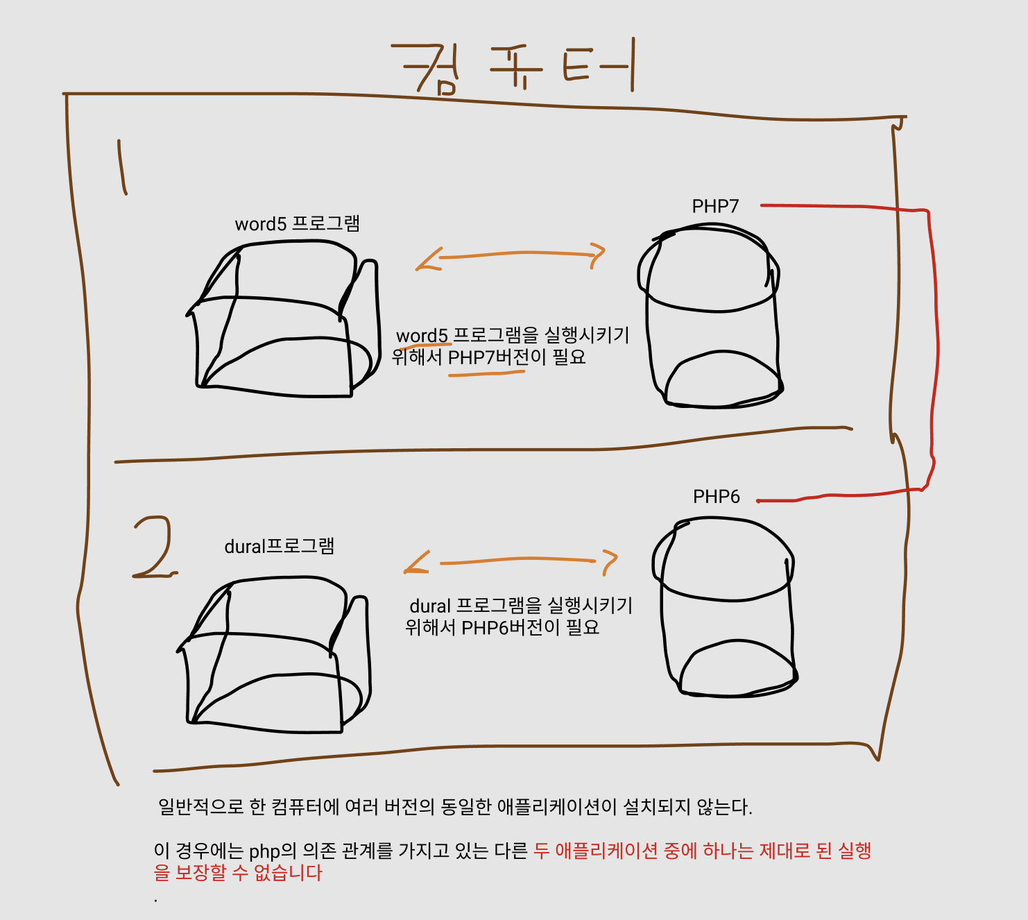 - 결국에는 php의 의존 관계를 가지고 있는 다른 두 애플리케이션(word5, dural) 중에 하나는 제대로 된 실행을 보장할 수 없습니다.