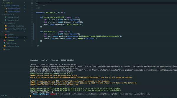 ex) sudo remixd -s /Users/anhyeongjun/Desktop/coding/Dapp_template --remix-ide https://ide.klaytn.com/ (내 폴더명을 집어넣은 예시문이다. contract폴더가 아니라 root폴더 경로로 해주어야합니다.)