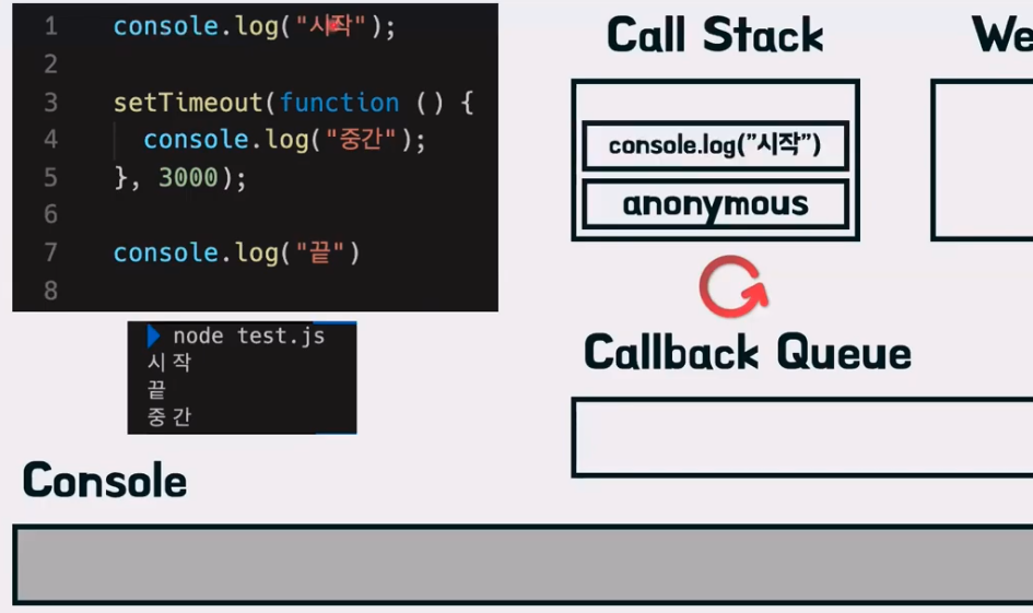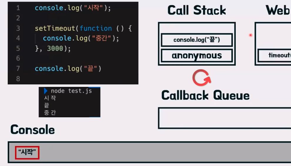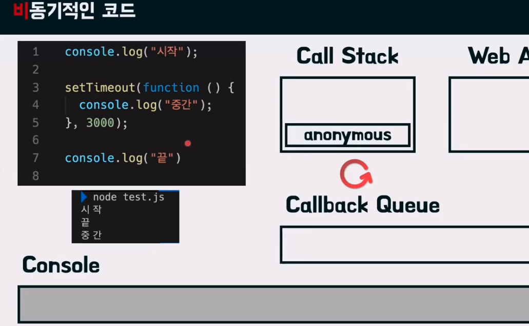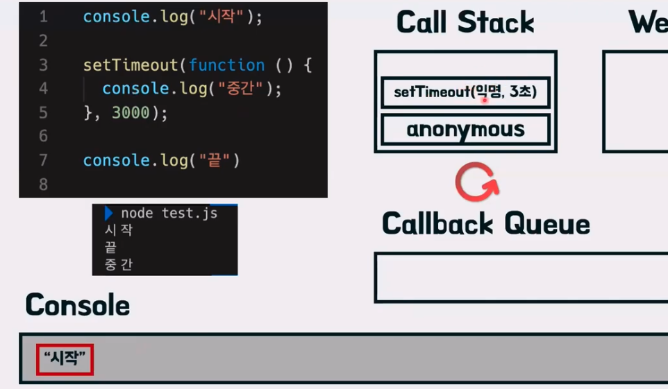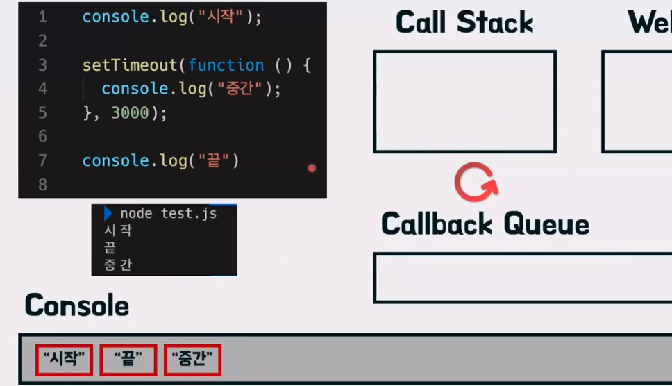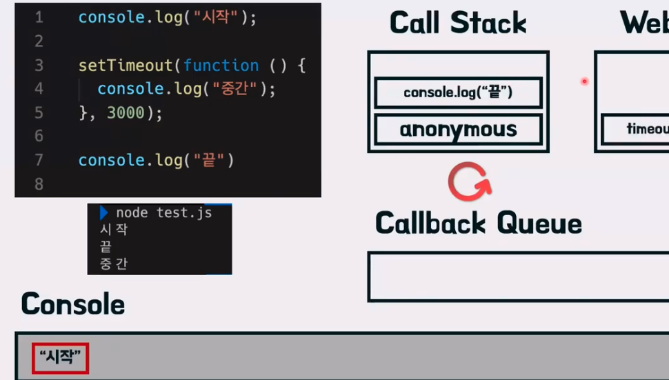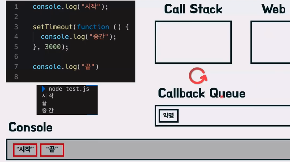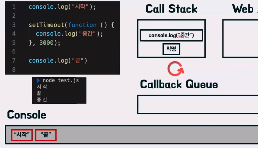 7. 비동기함수에 있떤 콜백함수가 사용되게됩니다. 그럼으로써 console.log("중간")이 출력됩니다.