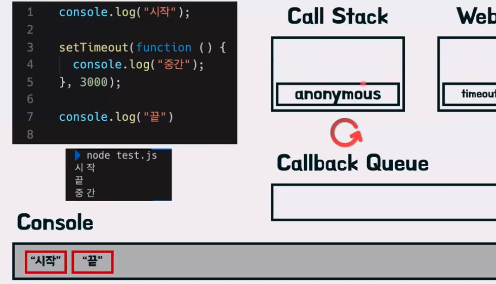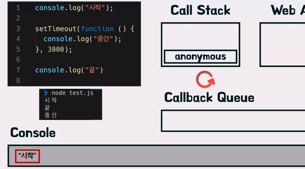 1. 콜스택에 anonymous(모든 코드를 가지고 있는 존재)가 먼저 올라가고 다음 console.log('시작')이 올라갑니다.