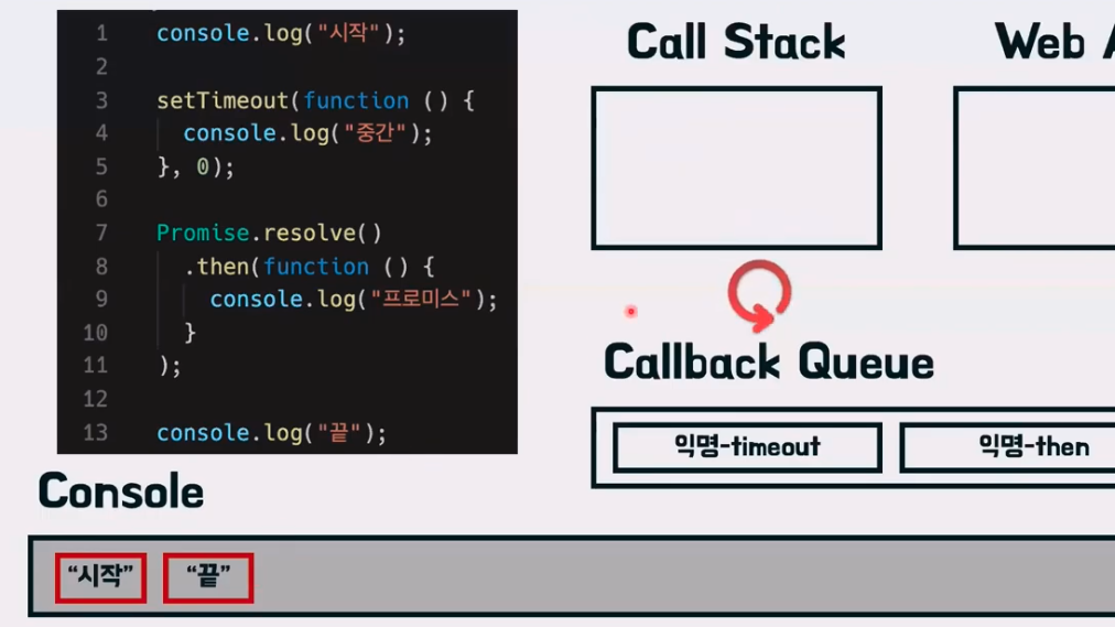 Queue자료구조이기 때문에 선입선출구조로써 익명-timeout이 먼저 실행될 것이라고 생각하는데요 then을 먼저 사용하게됩니다.
