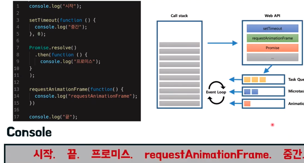 Event Loop => Queue에 할당된 함수를 순서에 맞춰 Call Stack에 할당해 준다.