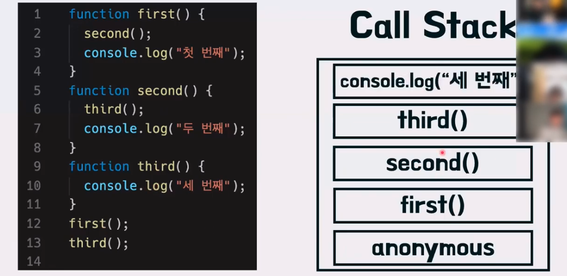 먼저 위와같은 사진에서 함수를 실행하게되면 Call Stack에 어떻게 쌓이는지 확인할 수 있는 대목이다.